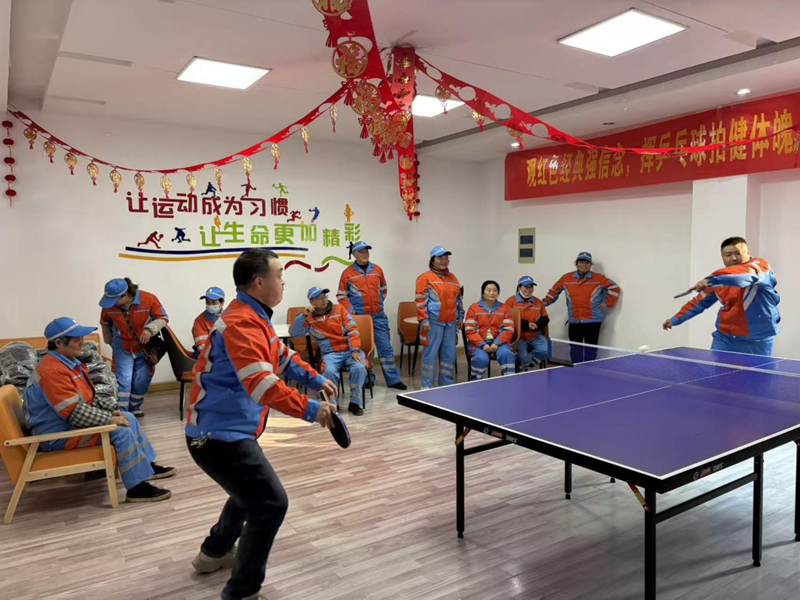观影结束后,乒乓球趣味竞技活动火热开启。工会驿站内的乒乓球桌旁瞬间成为欢乐的赛场,环卫工人们踊跃参与、同台切磋。发球精准刁钻,扣杀干脆利落,大家在你来我往的比拼中舒展筋骨、愉悦身心,在互帮互助的氛围里拉近彼此距离、增进工友情谊。日常工作的疲惫与压力,在阵阵欢声笑语中悄然消散,活动现场始终洋溢着团结奋进、轻松愉悦的浓厚氛围。