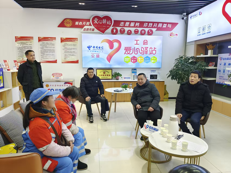 “师傅,您每天风吹日晒奔波,血压可得多留意,来坐下歇会儿,咱们免费测一测!”。1月19日,中国电信安庆分公司人民路营业厅户外劳动者工会驿站内,市总工会党组成员、副主席贺治华化身“临时站长”,亲自坐镇驿站,以“驿站站长”的身份与环卫工人、户外劳动者面对面亲切交流,拉家常、问冷暖,详细询问他们日常工作中的难点堵点,贺主席认真倾听、记录,并不时回应解答,现场暖意融融。