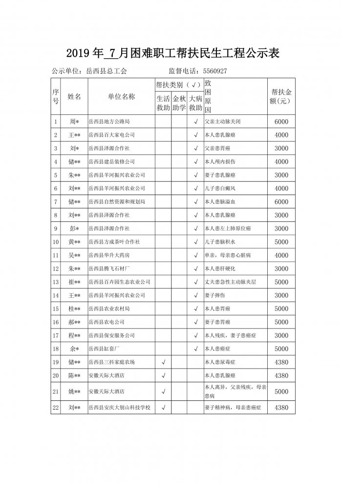 岳西县总工会2019年7月困难职工帮扶民生工程公示表