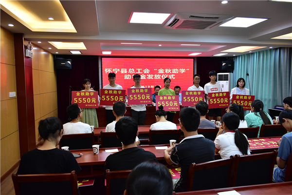 8月26日,怀宁县总工会举办2019年“金秋助学”资金发放仪式,县关工委主任丁风生、县人大常委会副主任、县总工会主席陈鑫杰、县总工会领导班子成员出席本活动,各乡镇工会、工会联合会负责同志,部分受资助学生代表、家长代表等参加了本次活动。