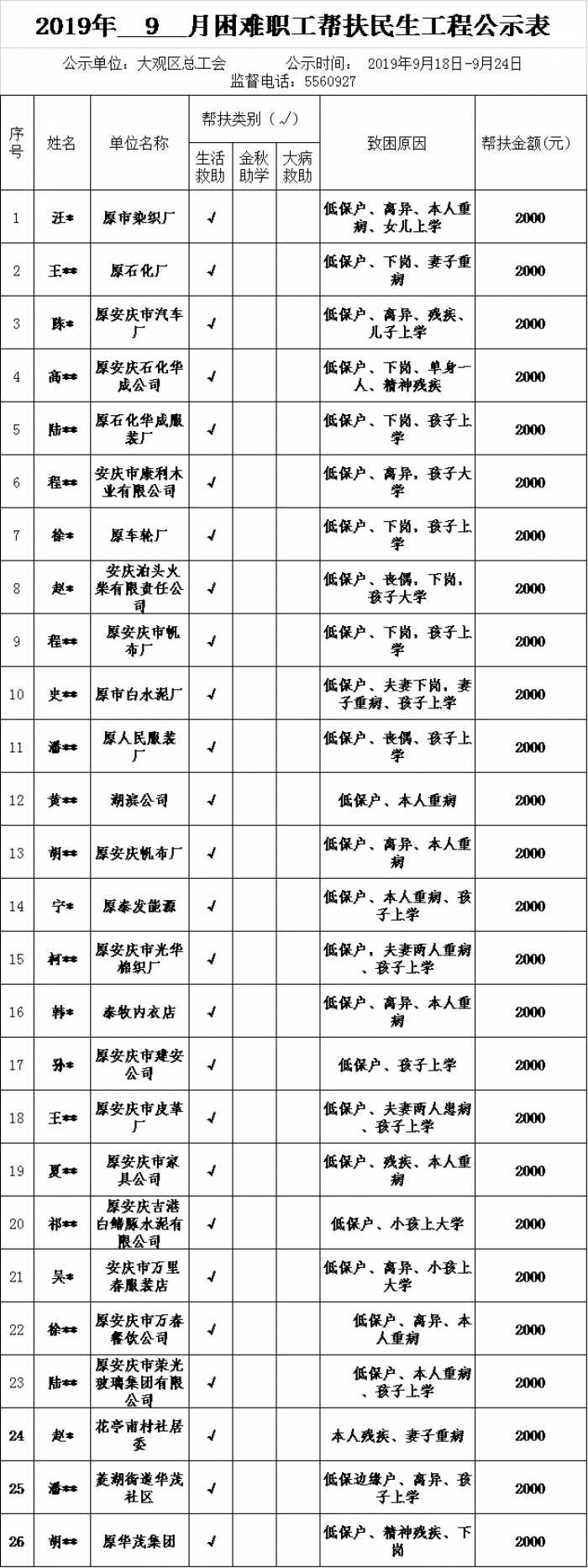 大观区总工会2019年9月困难职工帮扶民生工程公示表
