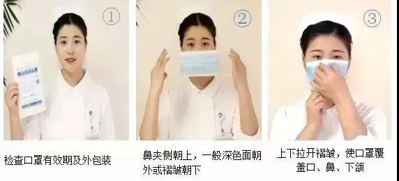 (2)正对脸部的应该是医用口罩的反面,也就是颜色比较浅的一面,除此之外,要注意带有金属条的部分应该在口罩的上方,不要戴反了。
