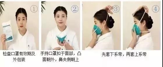 (3)分清楚口罩的正面、反面、上端、下端后,先将手洗干净,确定口罩是否正确之后,将两端的绳子挂在耳朵上。