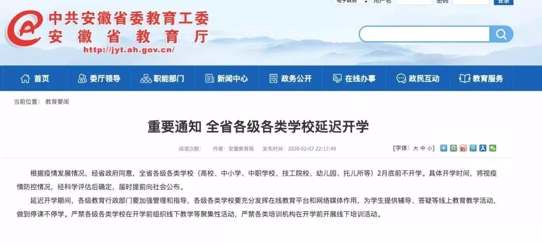 刚刚, 安徽省教育厅发布,根据疫情发展情况,经安徽省政府同意,全省各级各类学校(高校、中小学、中职学校、技工院校、幼儿园、托儿所等)2月底前不开学。具体开学时间,将视疫情防控情况,经科学评估后确定,届时提前向社会公布。 来源:人民网安徽频道 版权归原作者所有 如有侵权请联系删除