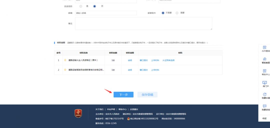 基本信息及材料上传完成后点击下一步完成事项申请。