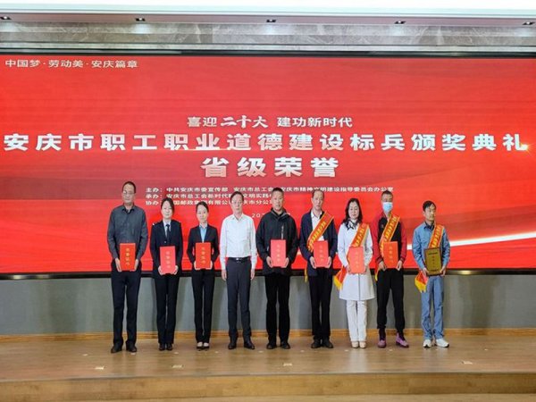 近日,中共安庆市委宣传部、安庆市总工会、安庆市精神文明建设指导委员会办公室联合召开了安庆市职工职业道德建设标兵颁奖典礼。岳西县职工服务中心荣获“安徽省职工职业道德建设优秀单位”、“安庆市职工职业道德建设标兵单位”荣誉称号,岳西县招商中心荣获“安庆市职工职业道德建设先进单位”荣誉称号,安徽红方工艺品有限公司方红、岳西县城市管理局环卫所吴伟荣获“安庆市职工职业道德建设先进个人”荣誉称号。