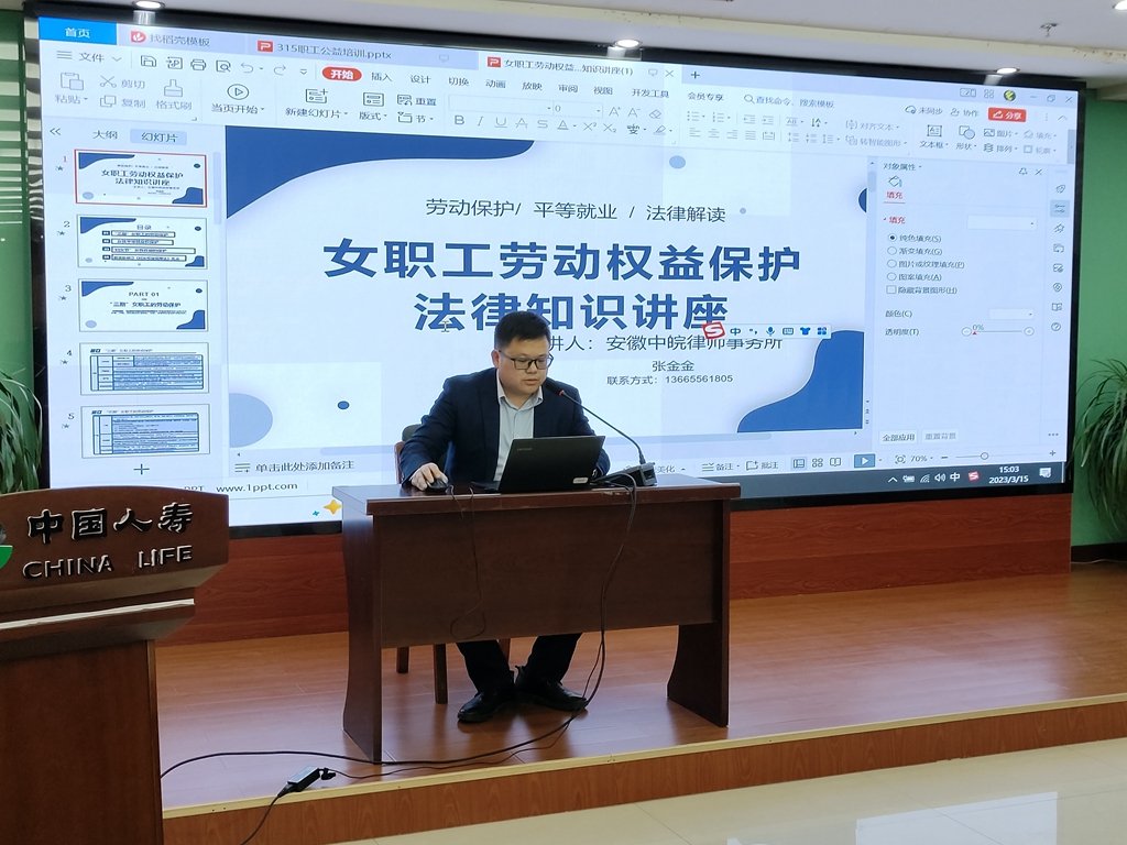 3月15日下午,安庆市“五一学堂”职工公益培训--女职工劳动权益保护法律知识讲座在中国人寿保险公司举办,为职场女职工们带来了一场精彩生动的妇女维权法律知识专题讲座。