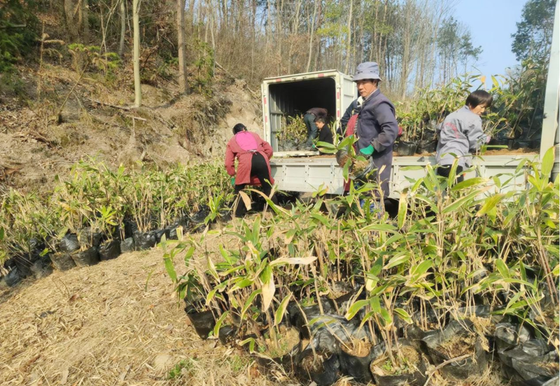 两辆满载着粽叶苗的货车,缓缓驶进香茗山粽叶基地,大家分工协作,卸车、运苗、挖坑、整地,齐心协力栽下了一株株粽叶苗,大家干劲十足,现场一派热火朝天的繁忙景象,让光秃秃的山上增添了一些色彩。